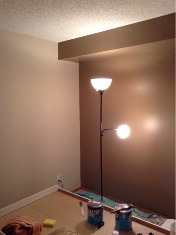 Then on Sunday after church we got right down to business once again. We sanded down the putty so it would be even with the wall. We then cleaned and wiped down the walls with warm water. Over all blemishes and putty we painted primer over top. Once everything else was prepped I taped all the edges and trim so we would be able to start painting once the primer dried. Since we had to wait an hour for the primer to dry, we were able to take a dinner break. Later on that evening the primer had finally dried which meant we were able to start edging. Edging didn't take too long, we just had to be careful since the tape would bleed a little. I worked along the door frame and bottom trim when edging, and my dad worked on a ladder and did edging along the ceiling. Finally we were able to paint. We only got to painting one entire wall and half of the two other walls. Tonight we were able to finish the 3 walls that are the lighter tone brown. I'm excited that part of the room is done. Soon I'll be able to move furniture back into its place. For the past few nights I haven't been able to sleep in my own room because of all the painting and renovations. I must say the couch isn't nearly as comfortable as my own bed.